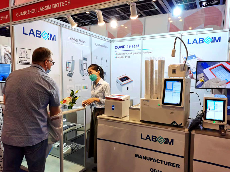 本屆展會上藍勃生物攜干式熒光免疫分析儀AFS-1000、手持式干式熒光免疫分析儀AFS430、膠體金免疫層析分析儀AGS1000,與組織盒激光打號機TB586UV、載玻片熱轉印打號機G304等明星產品亮相,展會現場吸引了大批觀眾前來溝通交流。
